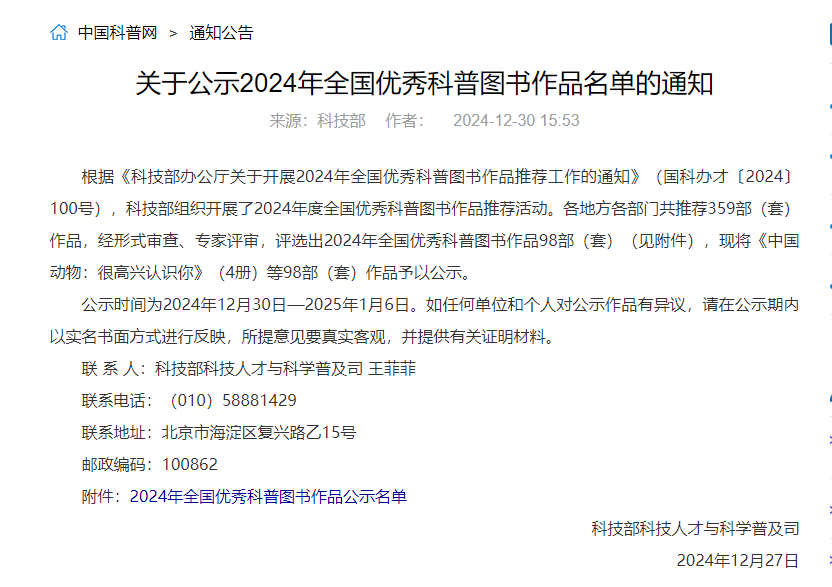 2024年12月底,科技部科技人才與科學普及司公示了2024年全國優(yōu)秀科普圖書作品名單。