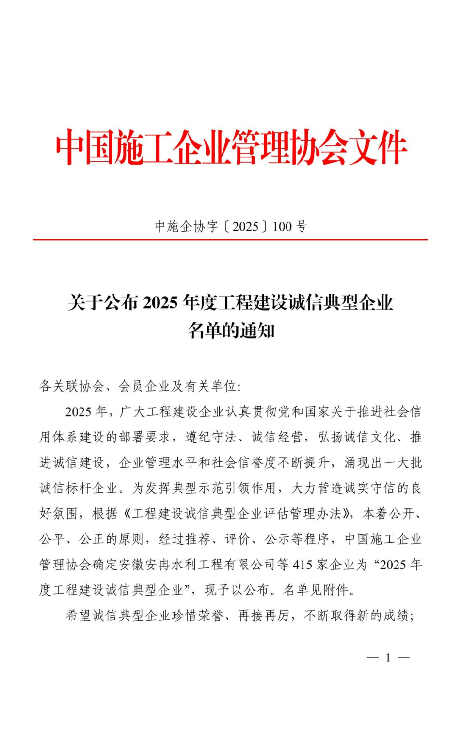 近日,中國施工企業(yè)管理協(xié)會正式發(fā)布《2025年度工程建設(shè)誠信典型企業(yè)名單》,湖北華夏水利水電股份有限公司憑借卓越的企業(yè)信譽(yù)、規(guī)范的經(jīng)營管理與扎實(shí)的誠信建設(shè)成果,成功入選該名單,首次榮獲 “2025年度工程建設(shè)誠信典型企業(yè)” 榮譽(yù)稱號。