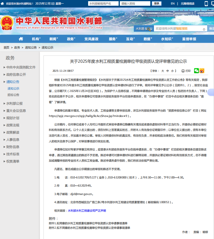 喜報|湖北華旭檢測有限公司順利通過水利部兩項甲級檢測資質公示
