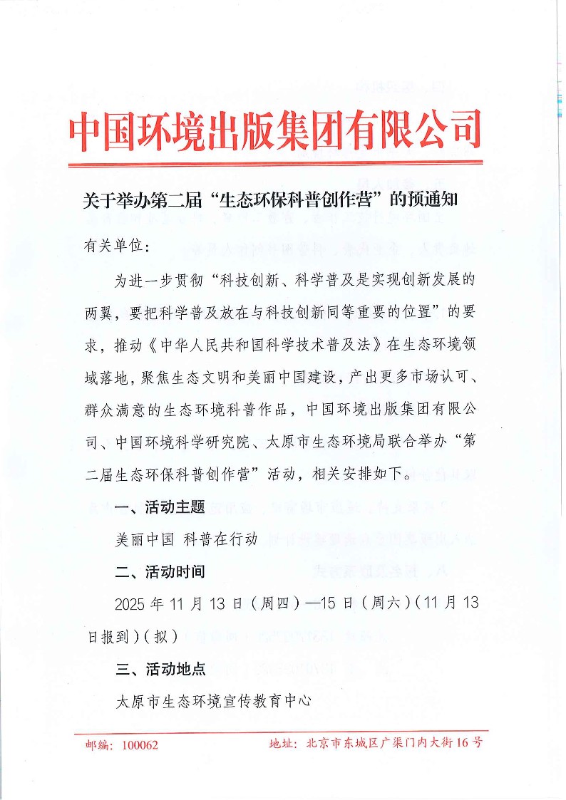 為進一步貫徹“科技創新、科學普及是實現創新發展的兩翼,要把科學普及放在與科技創新同等重要的位置”的要求,推動《中華人民共和國科學技術普及法》在生態環境領域落地,聚焦生態文明和美麗中國建設,產出更多市場認可、群眾滿意的生態環境科普作品,中國環境出版集團有限公司、中國環境科學研究院、太原市生態環境局聯合舉辦“第二屆生態環保科普創作營”活動,相關安排如下。