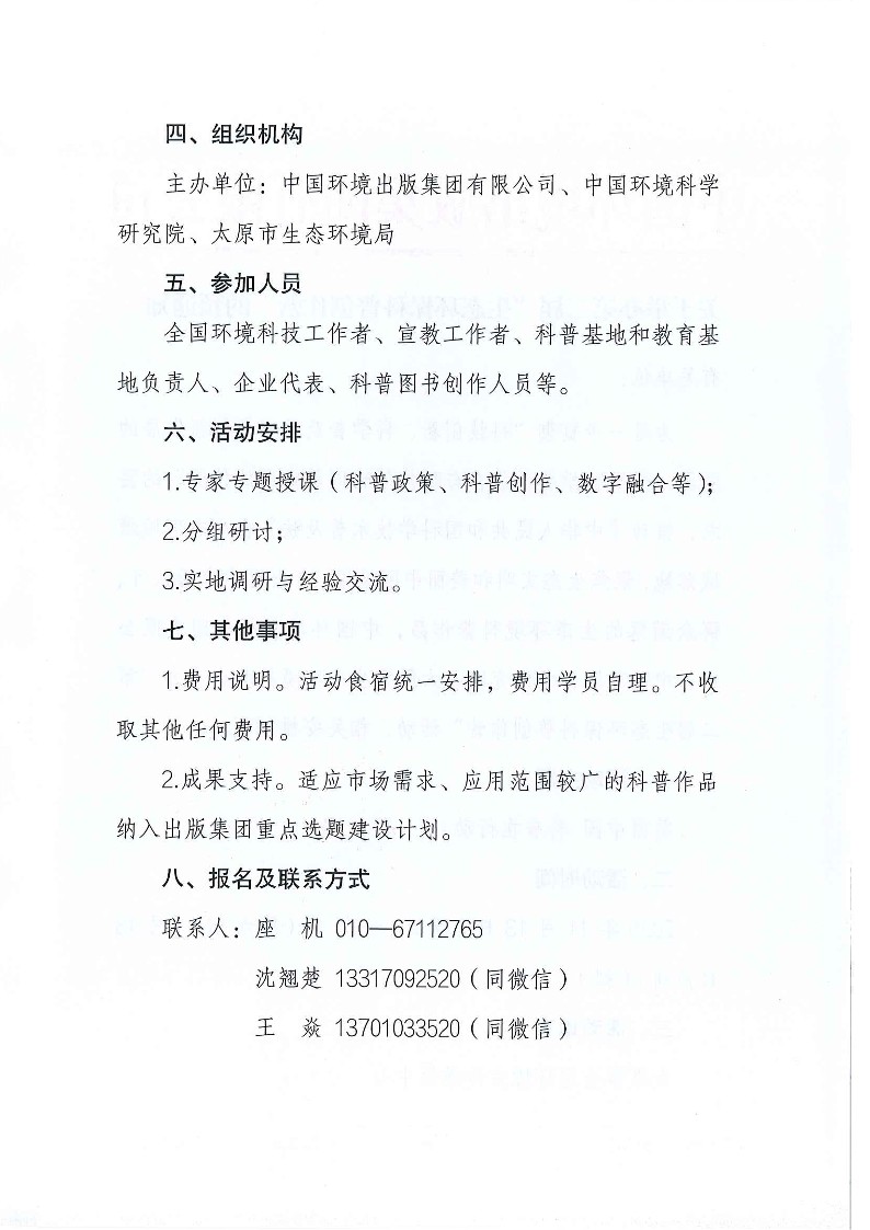 為進一步貫徹“科技創新、科學普及是實現創新發展的兩翼,要把科學普及放在與科技創新同等重要的位置”的要求,推動《中華人民共和國科學技術普及法》在生態環境領域落地,聚焦生態文明和美麗中國建設,產出更多市場認可、群眾滿意的生態環境科普作品,中國環境出版集團有限公司、中國環境科學研究院、太原市生態環境局聯合舉辦“第二屆生態環??破談撟鳡I”活動。