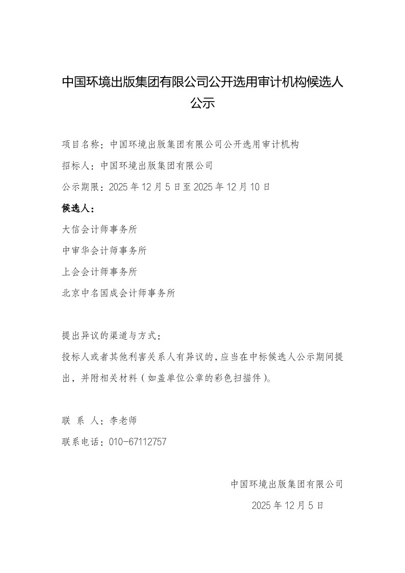 中國環境出版集團有限公司公開選用審計機構候選人公示